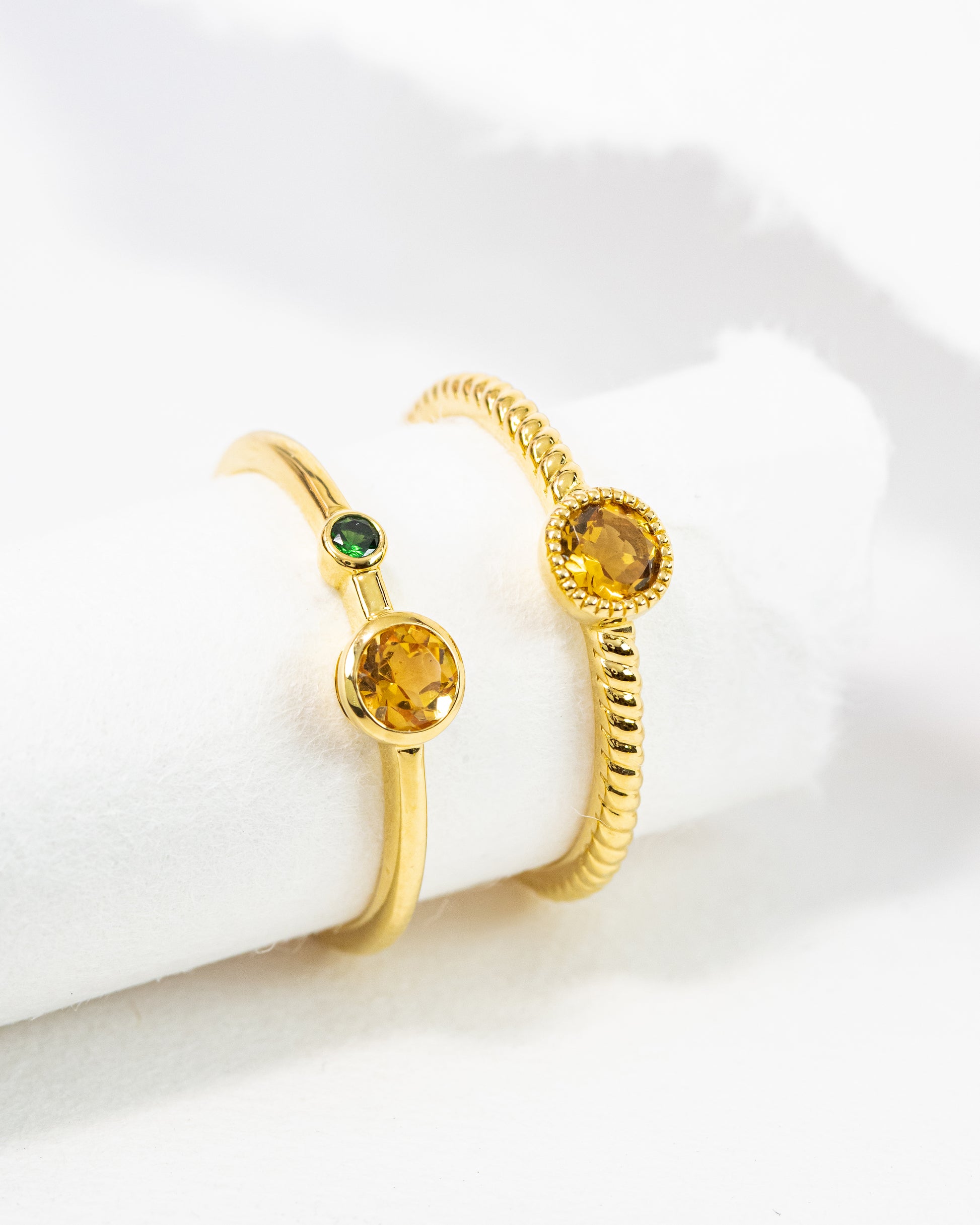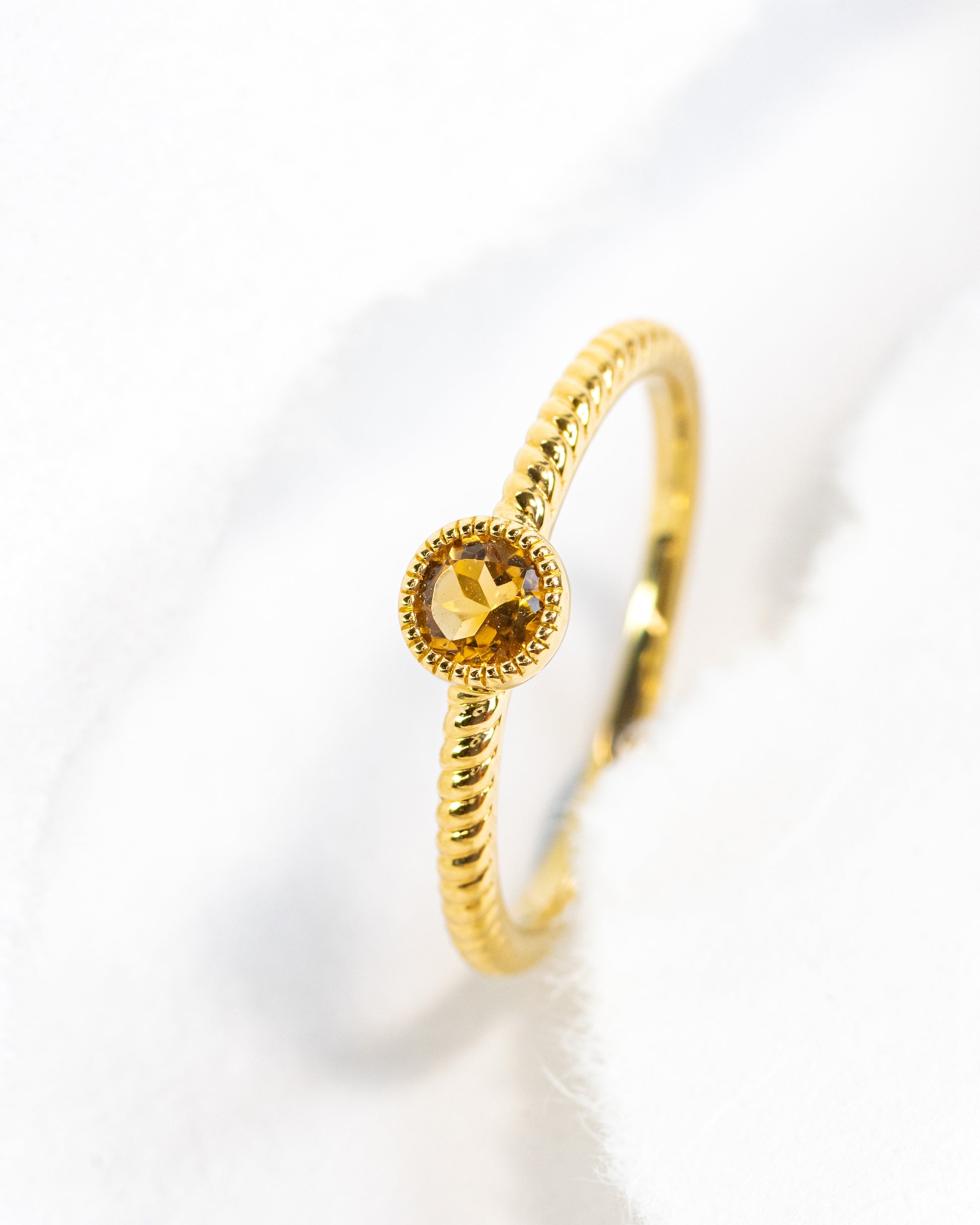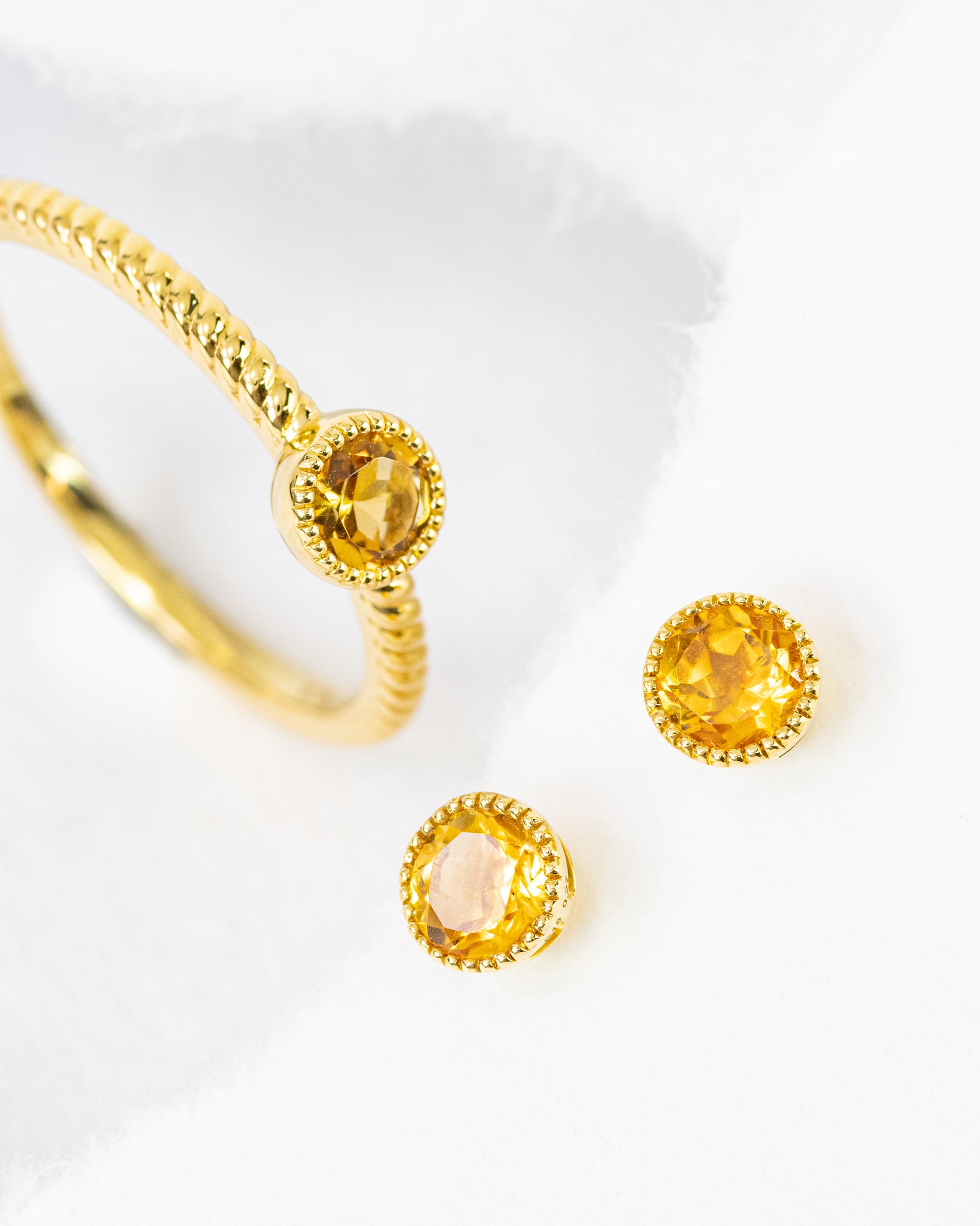 柑橘系の果汁のように瑞々しいシトリンをミル留めにして、アームにも細やかなデザインをあしらい上品に仕上げました。シーンを選ばずお使いいただけることも魅力のひとつ。