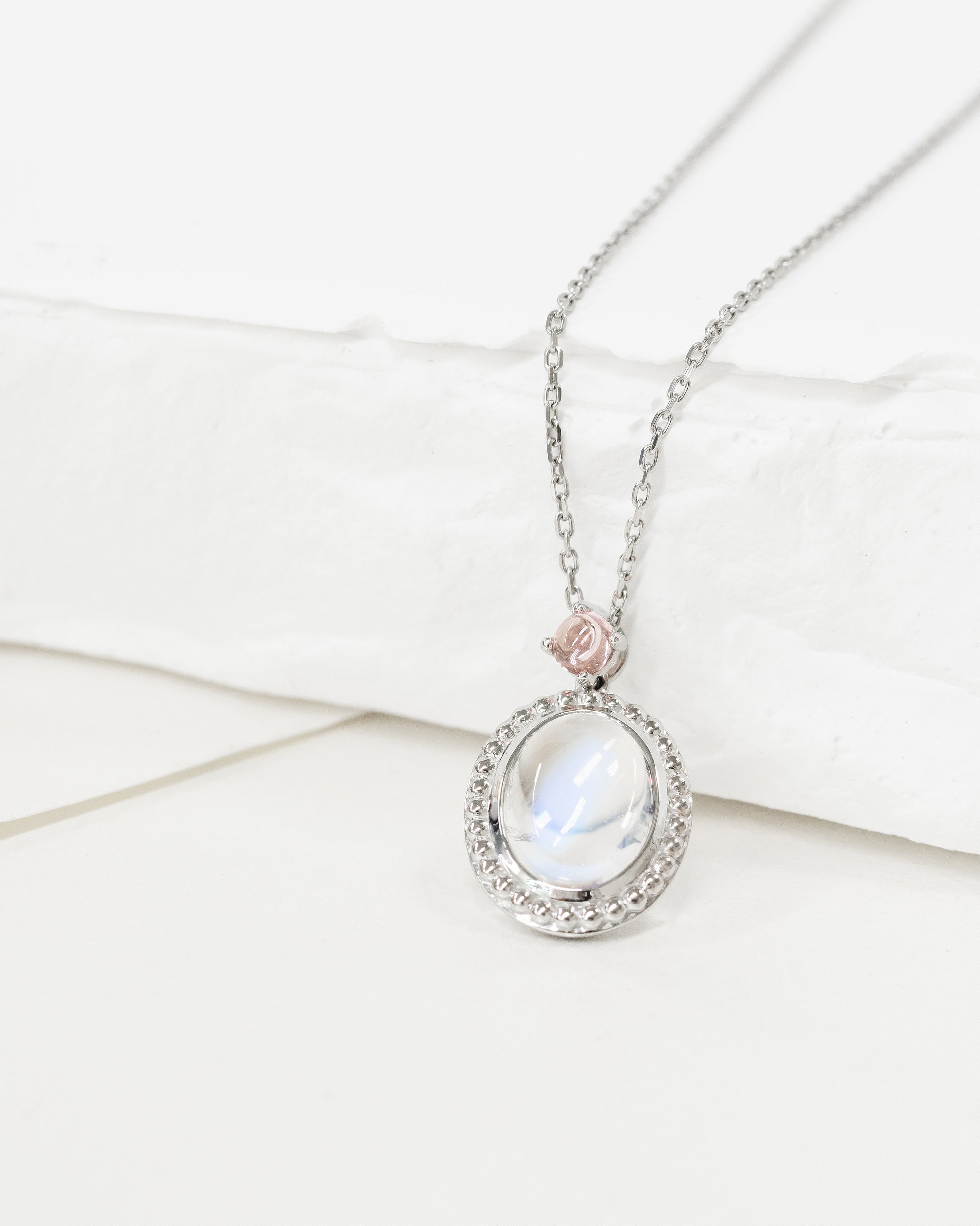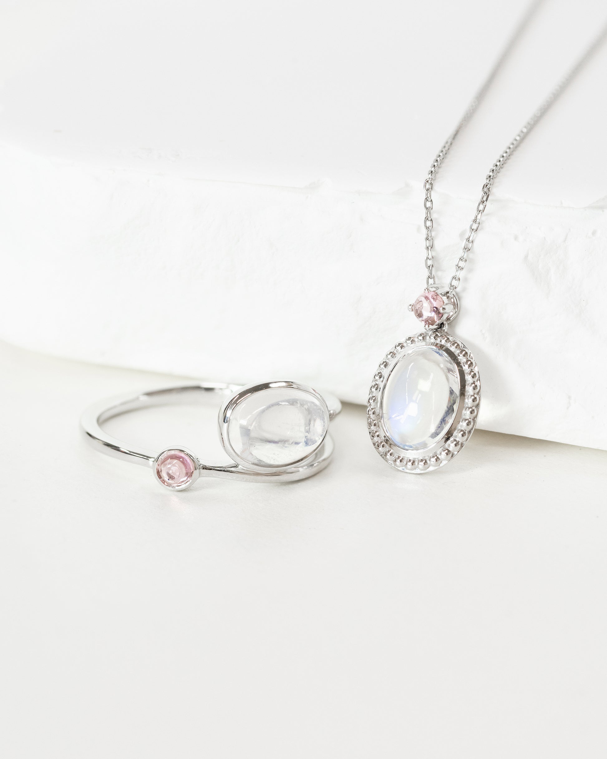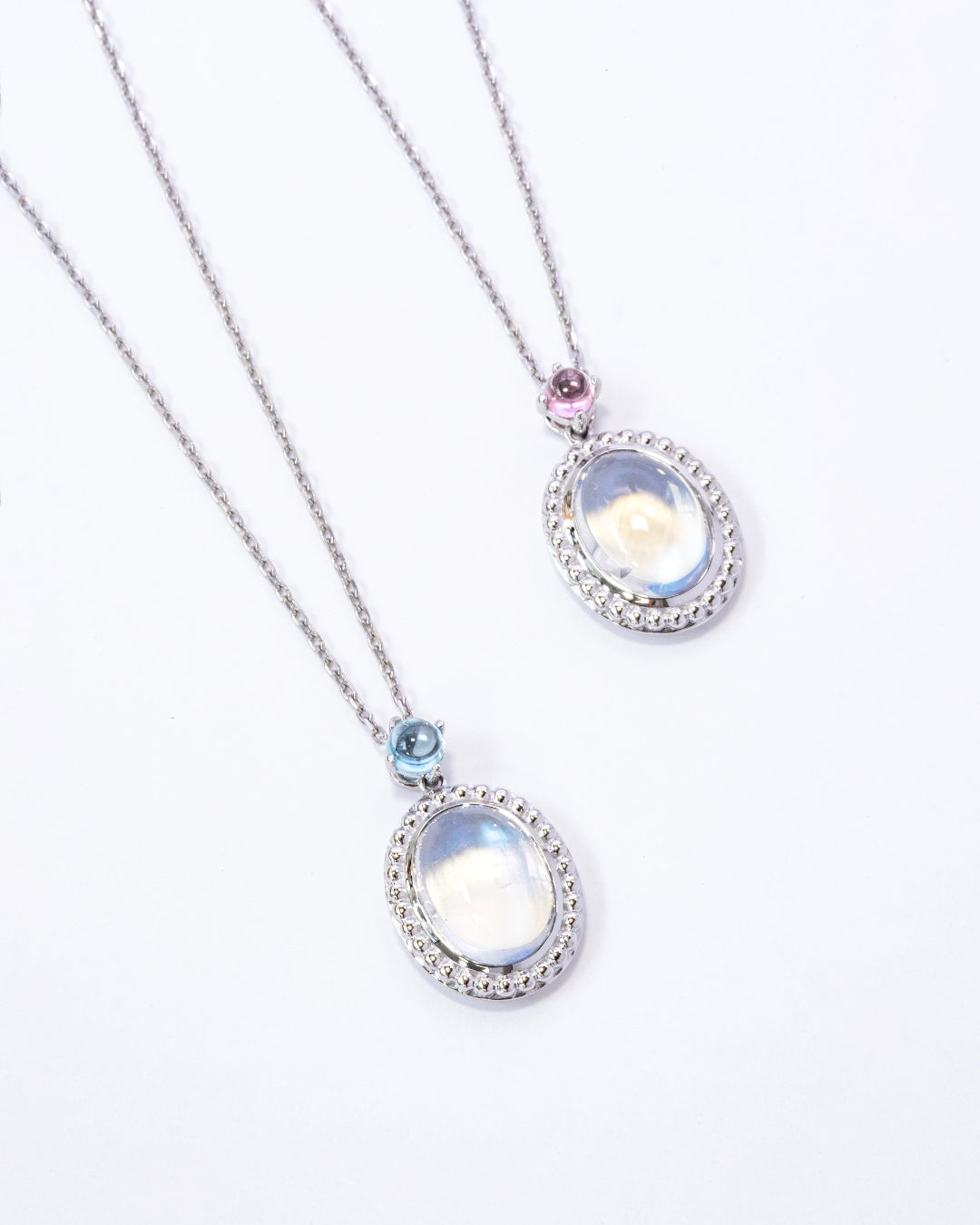 瑞々しい透明感と虹色の幻想的な色彩が魅力的なレインボームーンストーンネックレス。愛らしくも情熱的な輝きを放つピンクトルマリンがアクセントとなっています。