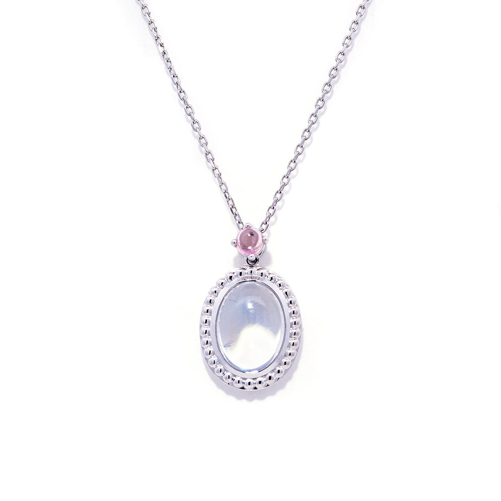 素材:プラチナ900/プラチナ850(チェーン)/レインボームーンストーン(アンデシンラブラドーライト)約6mm×8mm(1.08ct)/ピンクトルマリン(0.07ct)