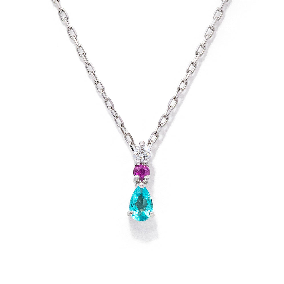 ネオンブルーの力強い発色が魅力的なペアシェイプカットのパライバトルマリンのネックレス。透明感のあるダイヤモンドとビビットな色合いのピンクサファイアを組み合わせたコントラストが、南国の海の色のようなパライバトルマリンの輝きを引き立ててくれます。