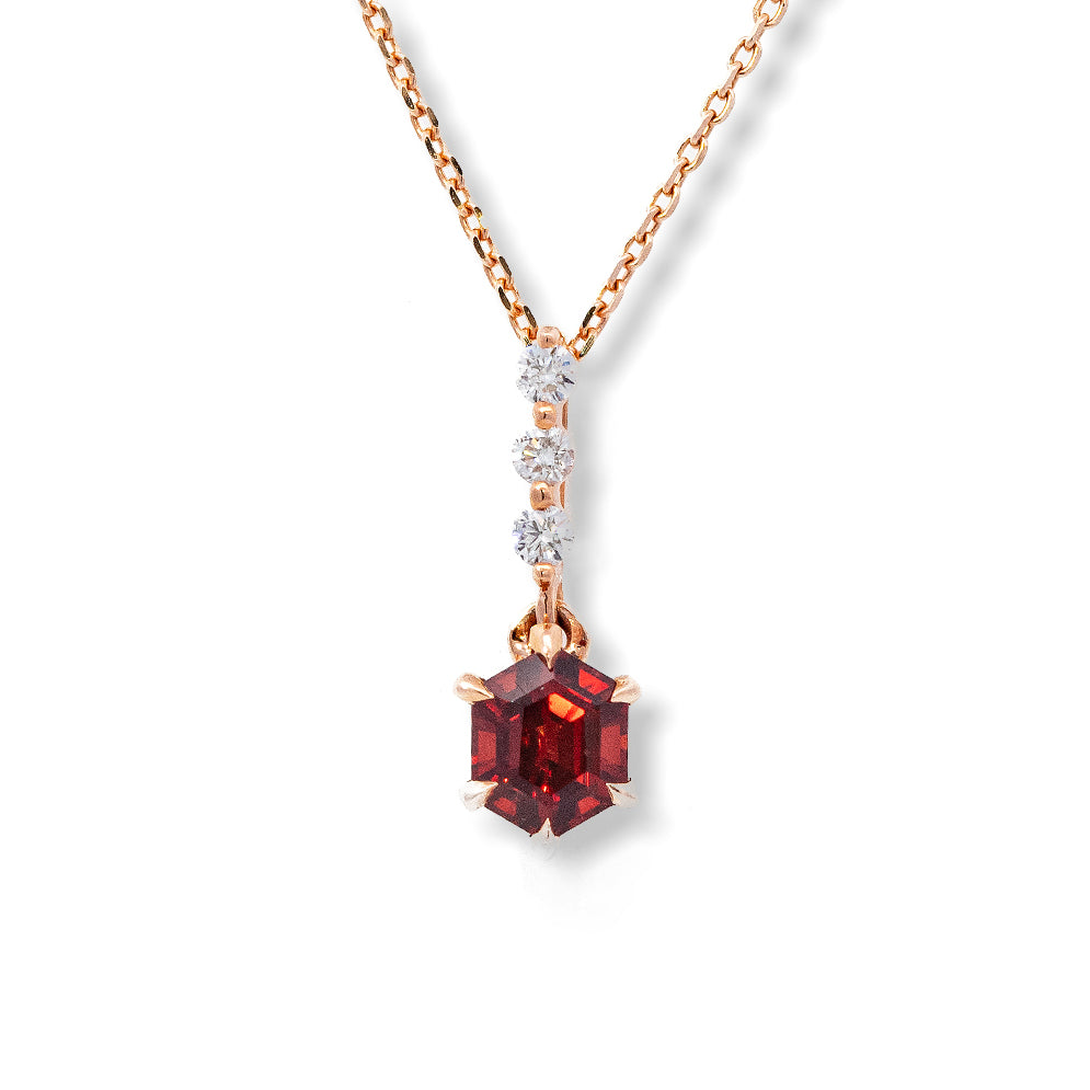 直線的な六角形のカットが独創的な雰囲気をかもしだすレッドスピネルのネックレス。