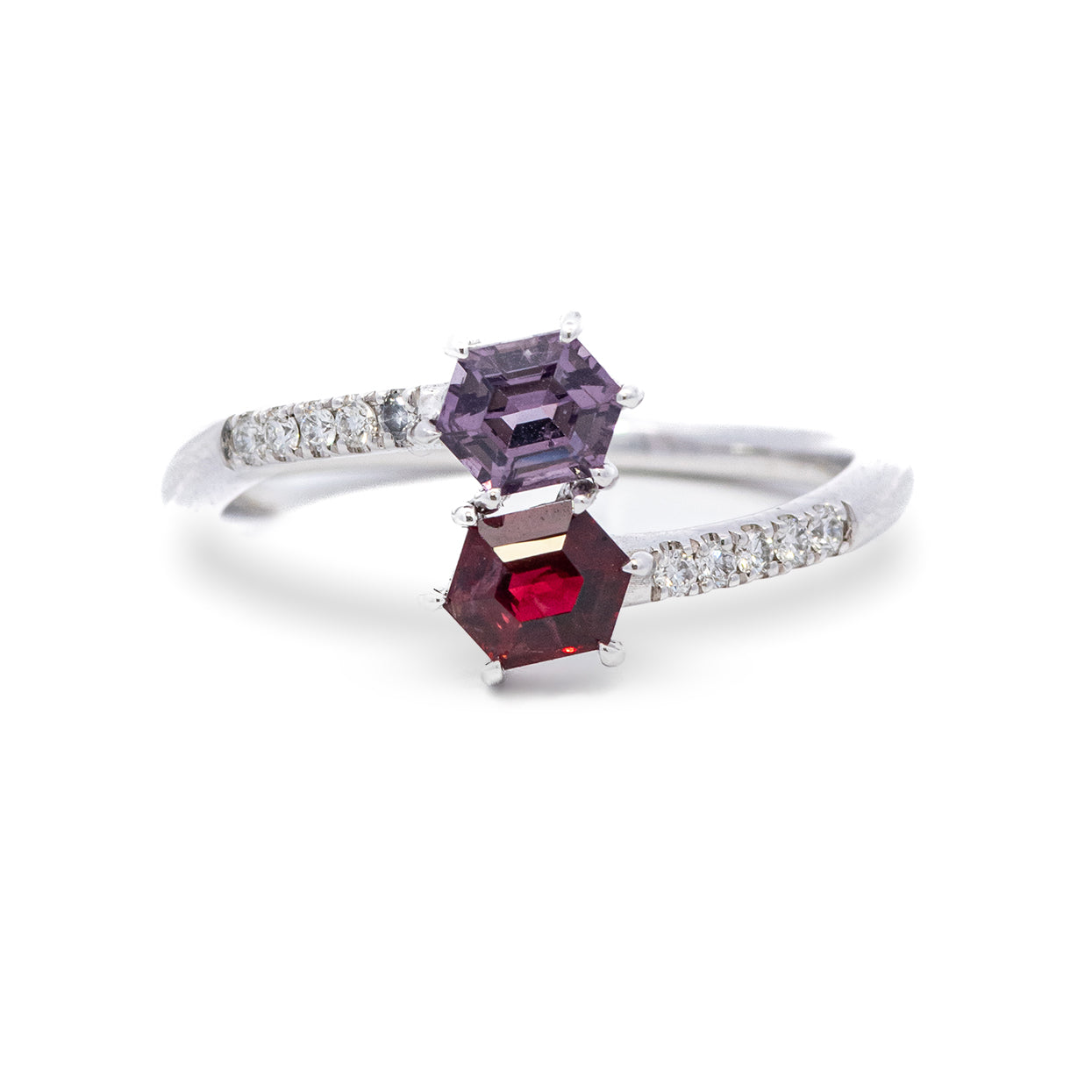 レッドスピネルとパープルスピネルの色彩のコントラストが美しいリング。