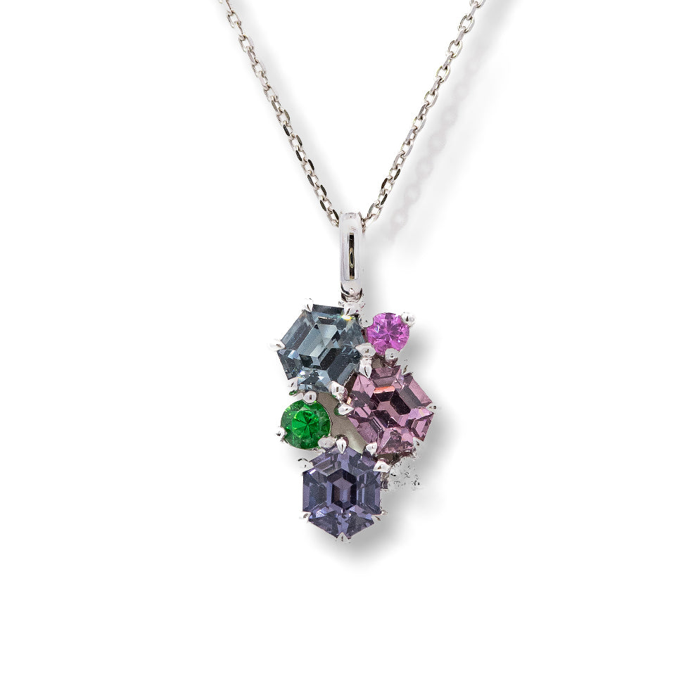 六角形のブルーグレースピネル・ピンクスピネル・パープルスピネルを中心に、グリーンガーネットとピンクサファイア、ダイヤモンドなど色もカタチも違う石たちが集まってステキなハーモニーを奏でています。
