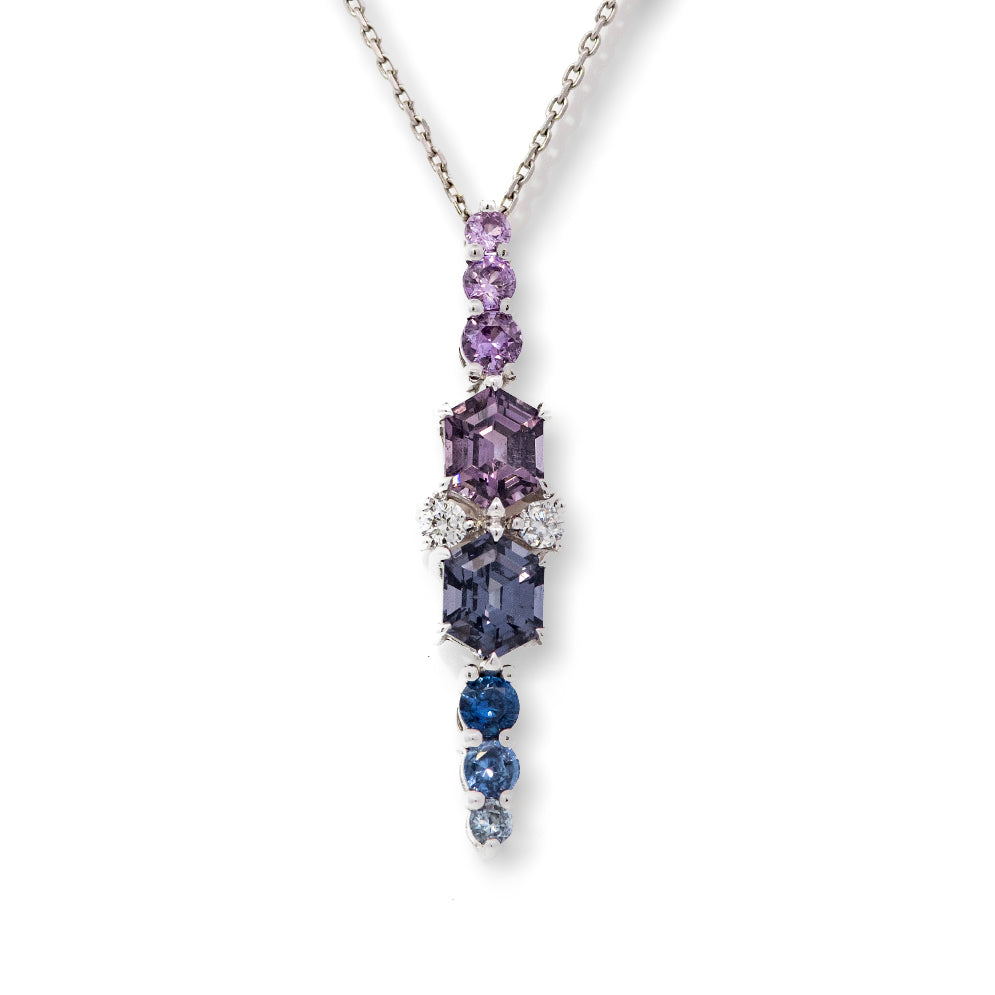 絶妙な色合いのニュアンスカラーグラデーションが美しいネックレス。六角形のスピネルを中心に先へと細く連なるサファイアのカラーの変化と脇に添えられたダイヤモンドの輝きが、しっとりとした華やかさを引き出しています。